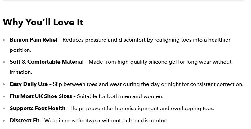 These separators gently space your toes apart, helping reduce pressure and friction from adjacent toes. Over time, this supports improved toe alignment and relieves discomfort caused by bunions or overlapping toes.