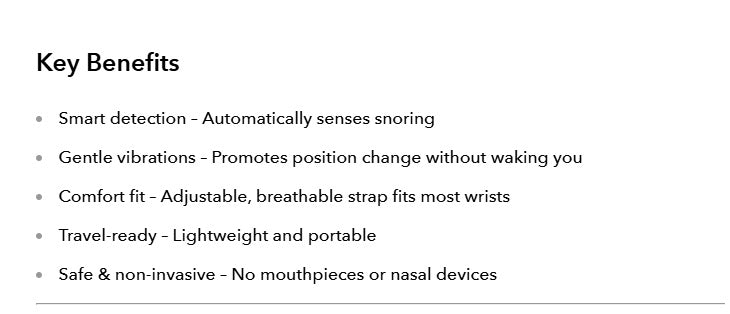 The Anti-Snore Wristband detects snoring and sends a gentle vibration to encourage a natural position change — without disturbing your sleep. Discreet, comfortable, and completely non-invasive.