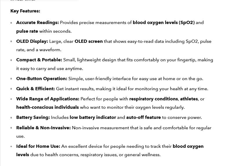 Stay in control of your wellness with our Fingertip Pulse Oximeter with OLED Display — compact, clear, and perfect for home, workouts, or anytime you need reliable readings.